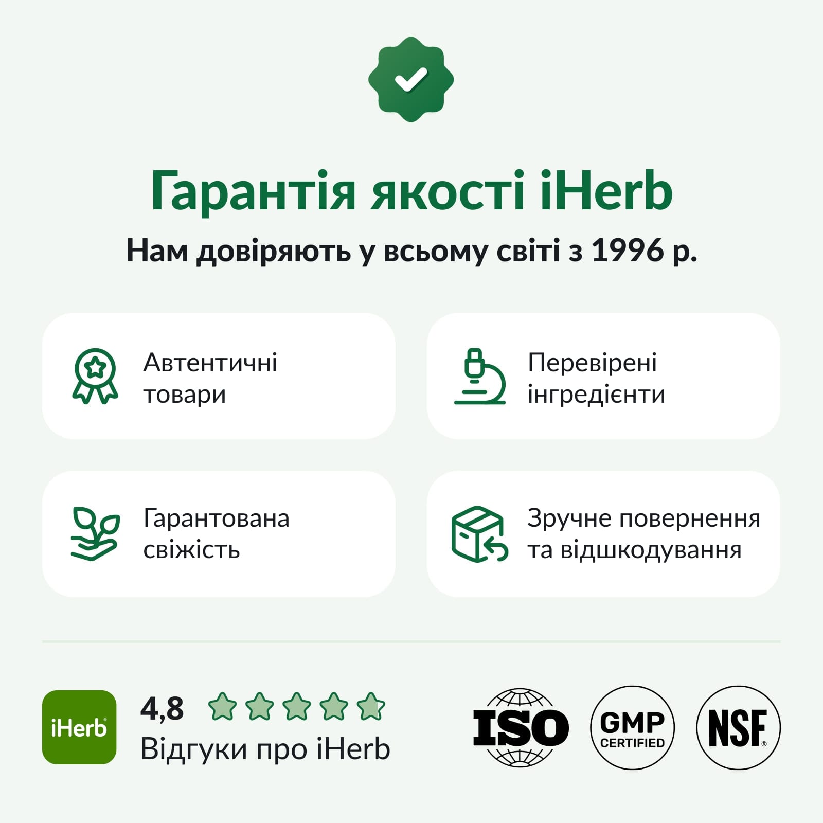 iHerb прагне забезпечити точність зображень товарів та інформації про них, але для деяких змін, внесених виробником в упаковку та/або інгредієнти, може очікуватись оновлення на нашому сайті. Хоча іноді товари можуть надходити з альтернативною упаковкою, свіжість завжди гарантована. Рекомендуємо перед використанням ознайомитися з інформацією на етикетках, попередженнями та вказівками до всіх товарів, а не покладатися виключно на інформацію, надану iHerb. Цей вебсайт був перекладений за допомогою машинного перекладу для зручності клієнтів. iHerb не стверджує і не гарантує, що переклад є повним або безпомилковим, і iHerb не несе відповідальності за будь-які помилки або неточності в перекладі.
